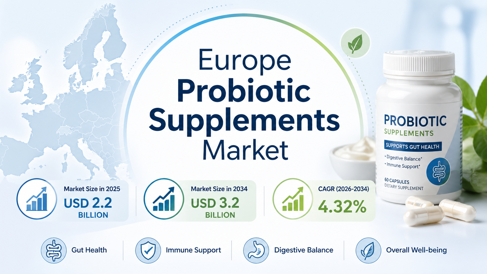 According to the latest report by IMARC Group‚ the Europe Probiotic Supplements Market was valued at USD 2․2 Billion in 2025 and is expected to grow at a CAGR of 4․32% during the forecast period (2026-2034) to reach USD 3․2 Billion by 2034․
