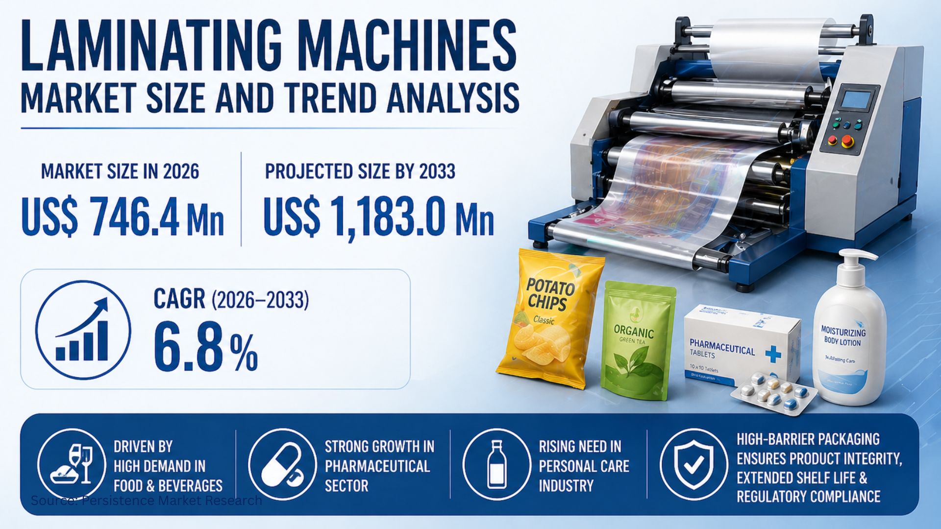 The global laminating machines market is witnessing steady expansion, fueled by rising demand across packaging, printing, and industrial applications. According to the latest study by Persistence Market Research, the market is valued at US$ 746.4 Mn in 2026 and is projected to reach US$ 1,183.0 Mn by 2033, registering a CAGR of 6.8% during the forecast period. The growing need for protective packaging, enhanced product aesthetics, and durability is significantly contributing to the market’s upward trajectory.
